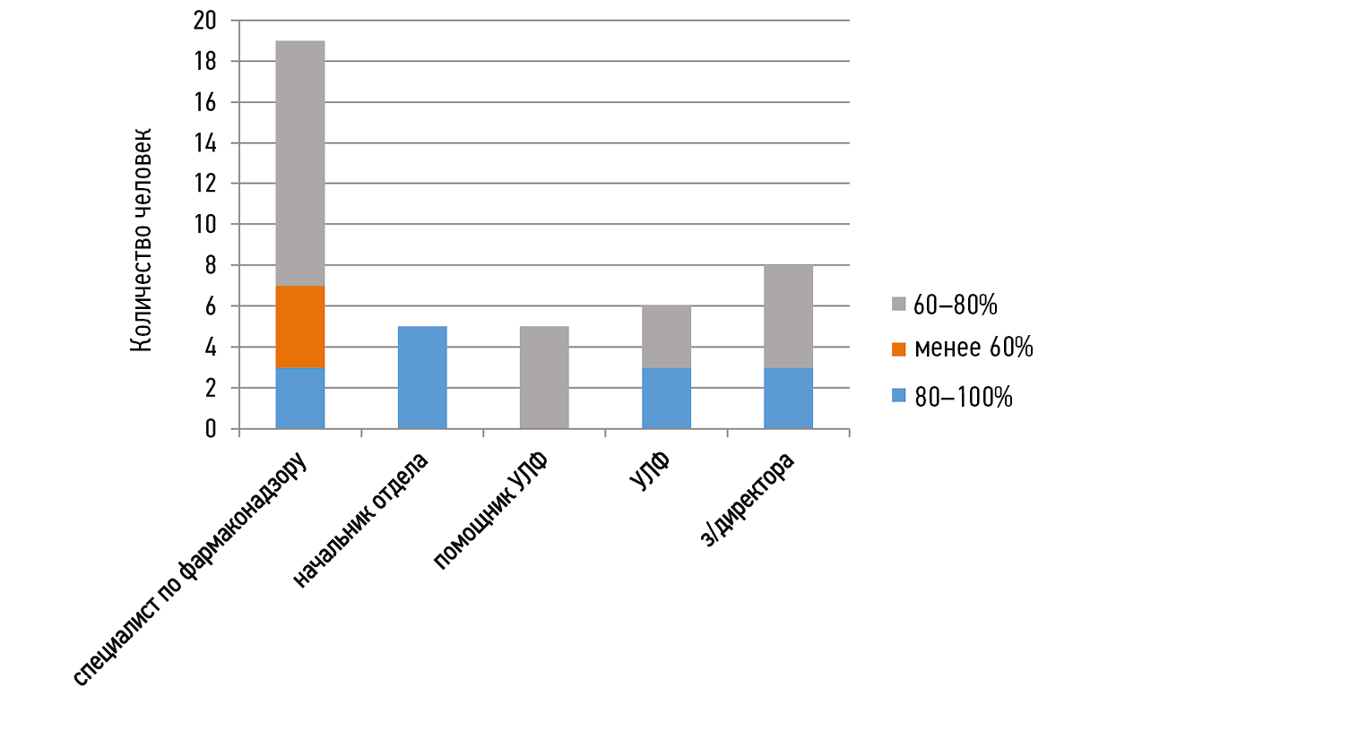 Корреляционная связь между занимаемой должностью и результатом опроса позволила выявить, что наиболее успешно справились с опросом специалисты по фармаконадзору руководящего уровня и УЛФ (рис. 10). При этом помощники УЛФ и специалисты по фармаконадзору хуже знакомы с нормативными требованиями по фармаконадзору. Это может быть связано с небольшим опытом работы в данной области или выполняемыми служебными обязанностями. Наилучшие результаты в опросе показали начальники отделов фармаконадзора. Вероятно, вследствие того, что они руководят работой по фармаконадзору, а также отвечают за результат работы всего отдела.
