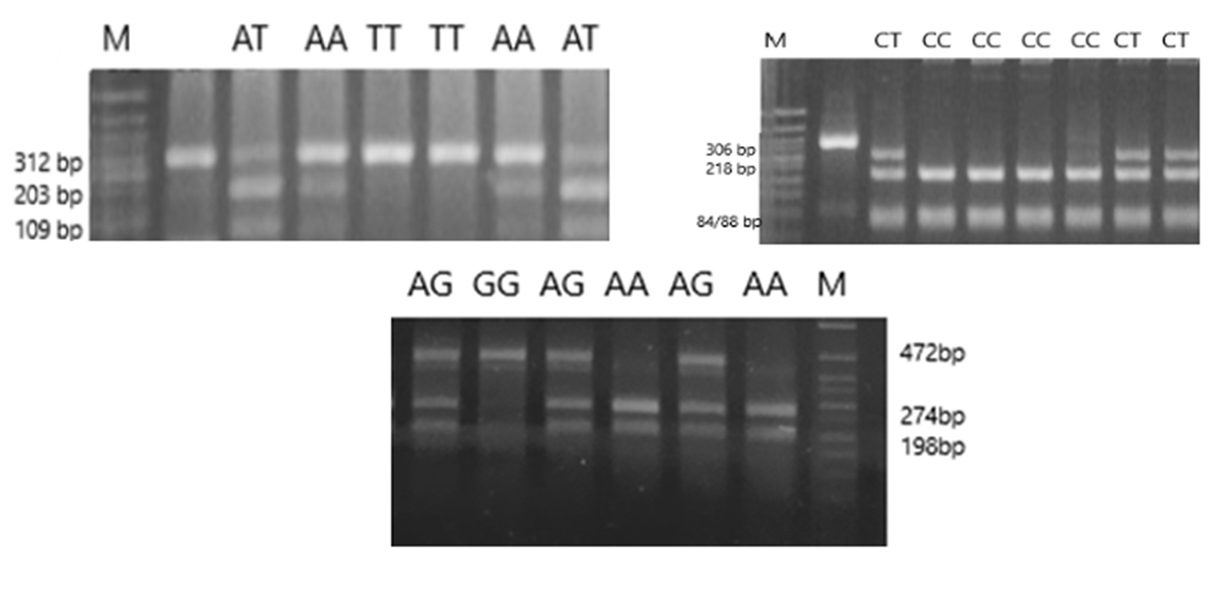Fig. Electrophoresis schemes for SNP detection and genotype identification in CAT, GPX-1, and TF genes: a — CAT rs7943316; AT genotype — 109, 203, and 312 bp bands; AA genotype — 203 and 312 bp bands; AA genotype — 203 and 312 bp bands; TT genotype — 312 bp band; b — GPX-1 rs1050450; CT genotype — 84/88, 218, and 306 bp; CC — 84/88 and 218bp; c — TF rs7943316; AG — 472/274/198 bp; AA — 274/198 bp; GG — 472 bp; М — DNA marker (100 bp). SNP — single nucleotide polymorphism; GPX-1 — glutathione peroxidase-1, CAT — catalase; TF — transferrin