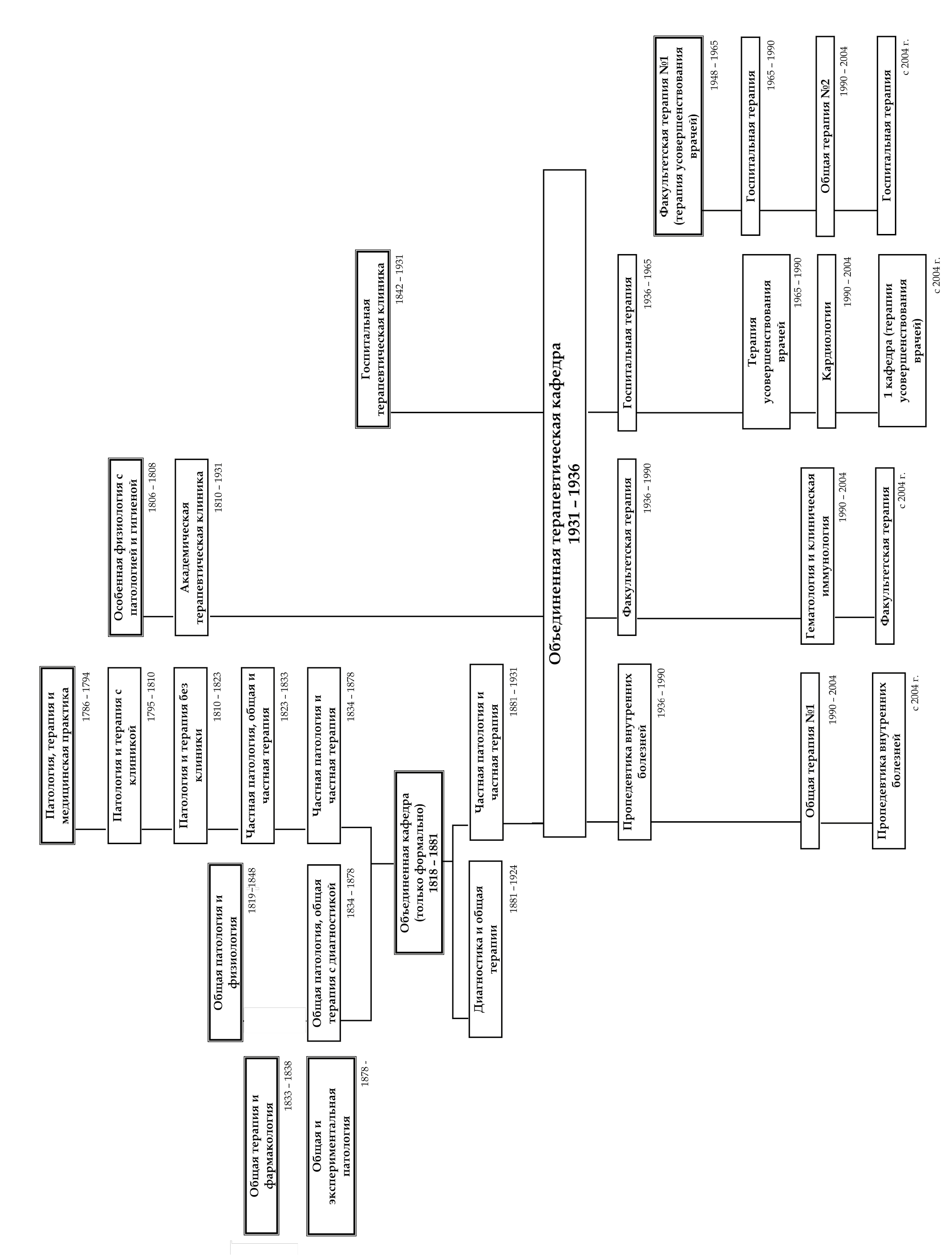 Преподавание внутренней медицины (медической практики) началось в октябре 1767 г. Ф.Т. Тихорским. Патологию, терапию и медическую практику в Главном врачебном училище с 1786 г. продолжил преподавать П. Гофман. Вторым профессором патологии и терапии Медико-хирургического училища назначен Г.И. Базилевич. Первым после переименования училища в академию профессором стал И.А. Смеловский. И.П. Франк, перенявший кафедру, начал прямую историческую ветвь терапевтической кафедры до 1931 г., когда кафедра частной патологии и терапии влилась в объединенную терапевтическую кафедру и вышла из нее в виде кафедры пропедевтики внутренних болезней. Параллельно в 1848–1924 гг. существовала кафедра общей терапии, присоединенная в итоге к первой кафедре. Благодаря И.П. Франку в 1806 г. сформировалась вторая терапевтическая кафедра, с 1810 г. существовавшая на постоянной основе и являющаяся в настоящее время кафедрой факультетской терапии. Изначально созданная как кафедра госпитальной терапевтической клиники и переименованная в 1965 г. по настоянию Н.С. Молчанова в кафедру терапии усовершенствования врачей № 1, фактически создана указом 19 января 1842 г. одновременно с назначением первого штатного руководителя профессора О.И. Мяновского.