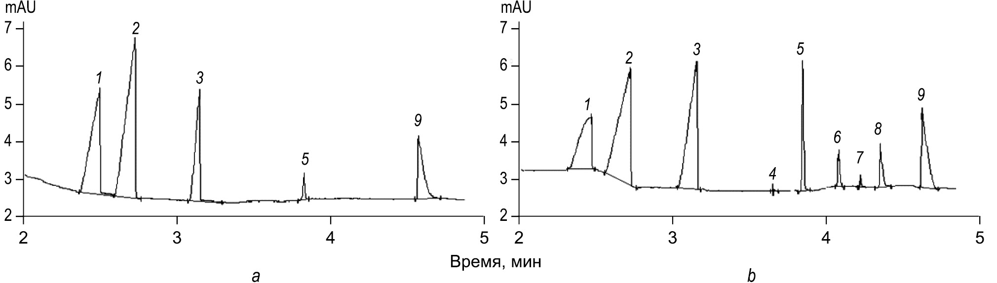 Непосредственно перед проведением анализа капилляр промывали 3 минуты дистиллированной водой, 5 минут 0,5 М раствором гидроксида натрия, 5 минут дистиллированной водой и 10 минут раствором ведущего электролита. Ввод пробы в капилляр пневматический (30 мбар, 5 с). Постоянное напряжение 25 кВ. Длина волны фотометрического детектора 267 нм, температура 20 °С, время анализа 6–7 минут.
