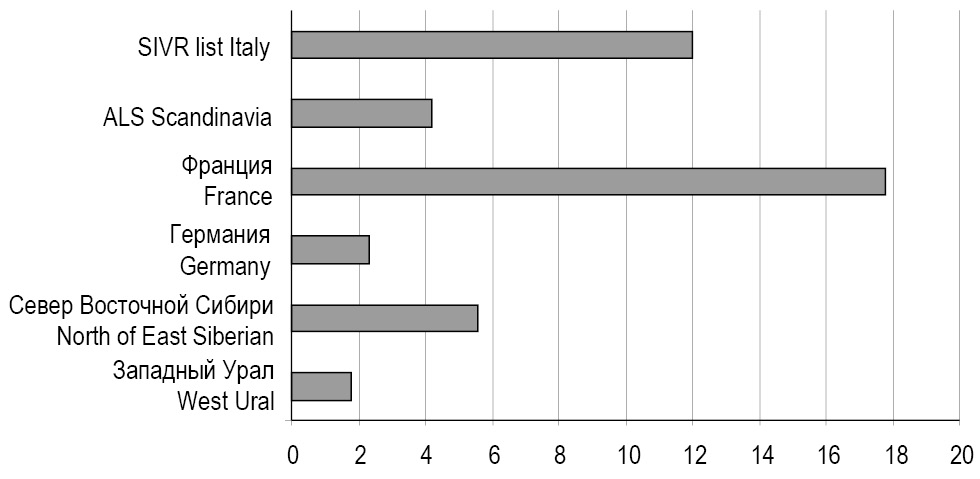 Мышьяк. Самым важным источником экспозиции к неорганическим соединениям мышьяка является питьевая вода, что выявляет зависимость от геохимических условий территории. Содержание мышьяка в крови неэкспонированных жителей района Севера Восточной Сибири превышает в 3 раза P95 в сравнении с группой взрослых Западного Урала. Концентрация мышьяка в крови исследуемых взрослых Российской Федерации ниже, чем на обследуемых территориях Германии и Франции. У жителей Западного Урала концентрация мышьяка ниже референсных значений диагностических лабораторий Италии и Скандинавии и находится в пределах референсных значений по Н. Тицу. Данные распределения представлены на рис. 1.