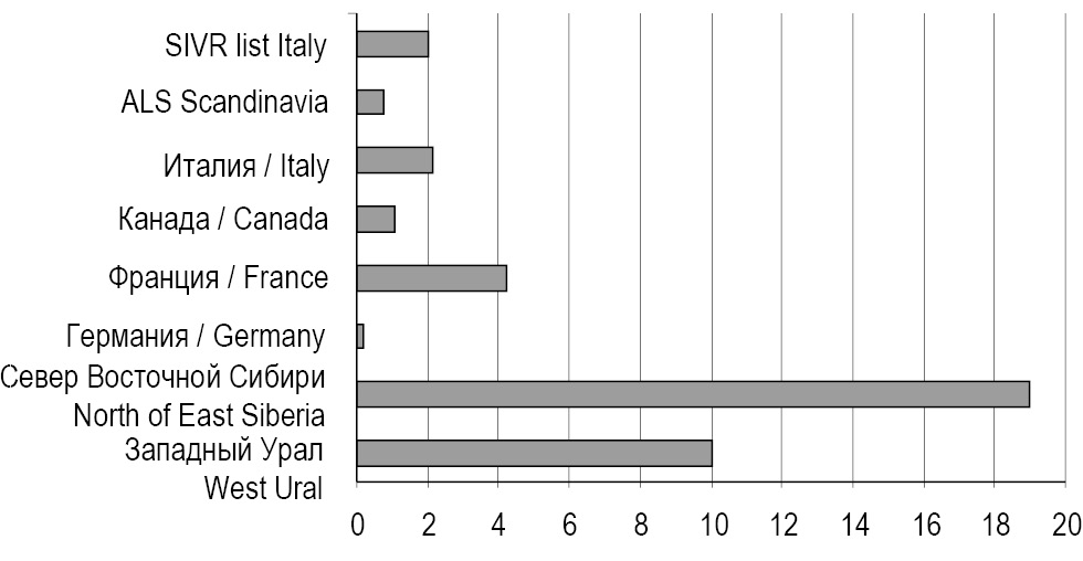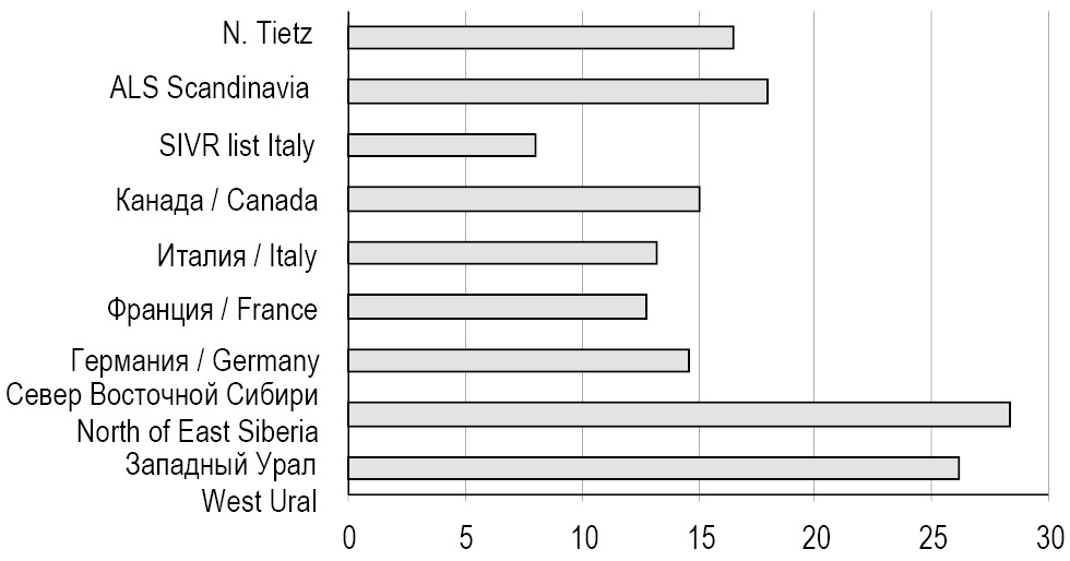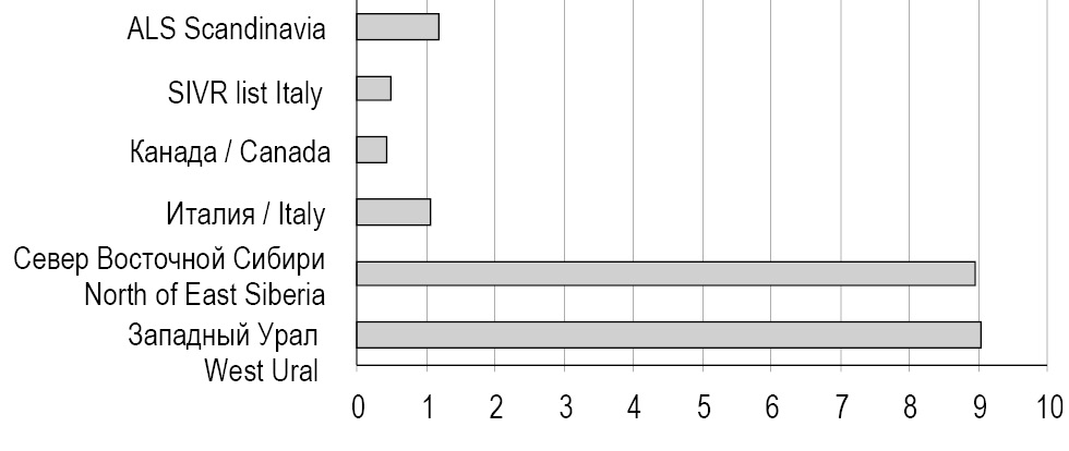 Никель. Содержание в крови неэкспонированных жителей Севера Восточной Сибири превышает P95 никеля в 2 раза по сравнению с группой взрослых Западного Урала. Среднее содержание никеля в крови взрослых Западного Урала превышает референсные уровни, используемые в диагностических лабораториях Италии и Скандинавии. Концентрация никеля находится в пределах референсных значений по Н. Тицу (рис. 3).