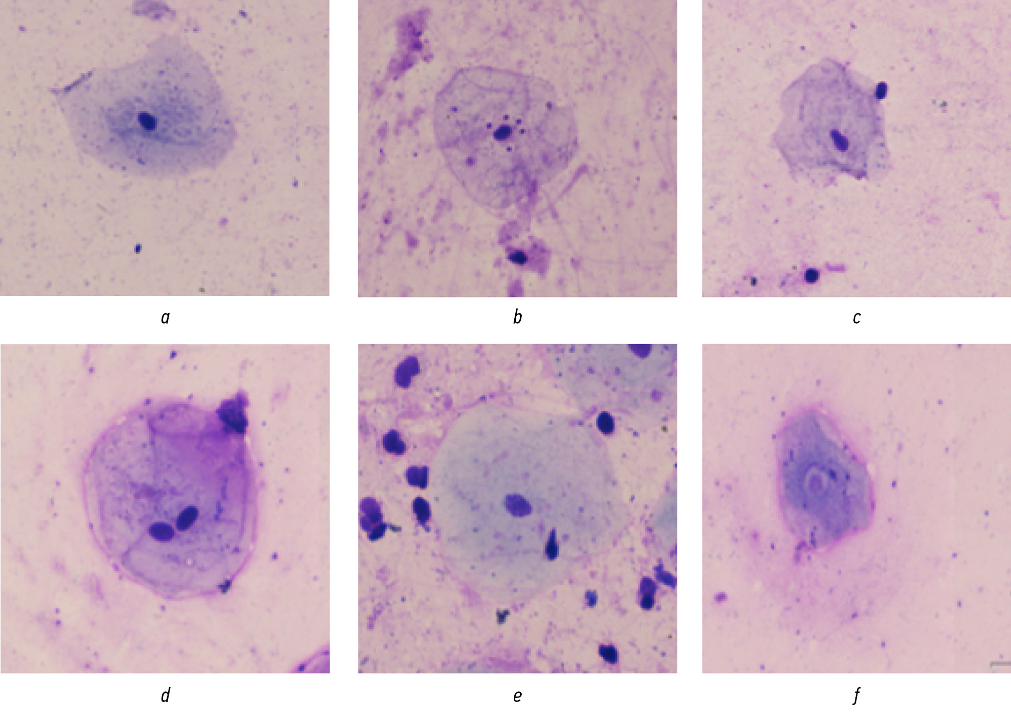 Цитологическое исследование проводили под иммерсией, с использованием светового микроскопа Axio Scope A1 (Carl Zeiss, Germany) при помощи программного комплекса «МЕКОС-Ц2» («МЕдицинские КОмпьютерные Системы (МЕКОС)», Россия). В полученных образцах исследовали реакцию адсорбции микроорганизмов (РАМ), индекс дифференцировки клеток (ИДК) и индекс кератинизации (ИК). В соскобах фиксировали цитогенетические нарушения (наличие микроядер, протрузий), показатели апоптоза (кариорексис, кариолизис) и пролиферативные процессы (наличие многоядерных и двуядерных клеток).