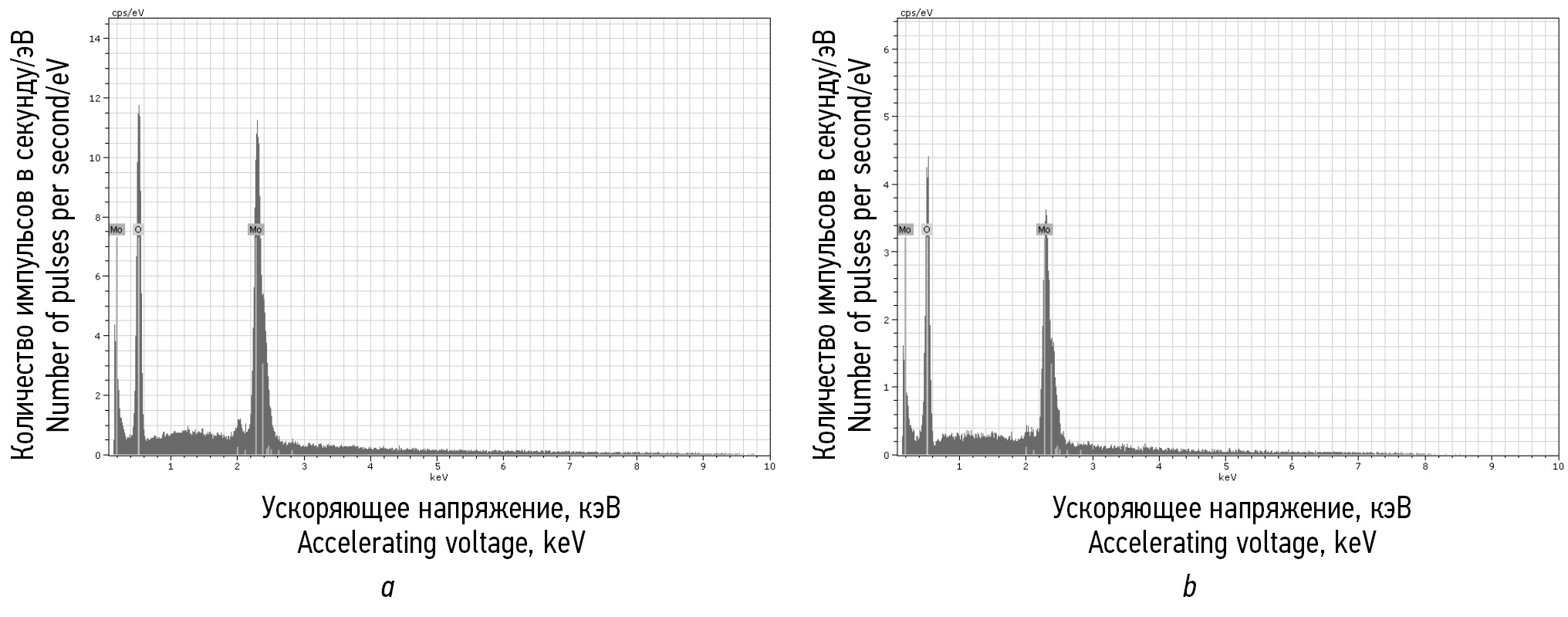 Согласно результатам рентгеноспектрального микрозондового анализа, химический состав нано- и микропорошков тестируемого вещества соответствует формуле, заявленной производителем (рис. 1, табл. 1). Метод РЭМ позволил установить, что нанопорошок МоО3 на 84,17% состоит из частиц размером <100 нм, средний диаметр которых — 58,80 нм. В составе микропорошка отсутствуют частицы размером <100 нм. Средний размер микрочастиц в сравнении с наночастицами в 57,99 раза больше (3410,0 нм) (рис. 2). С помощью анализа изображений, полученных методом РЭМ, установлен коэффициент округлости НЧ МоО3, составивший 0,94, что соответствует сферической форме. Для сравнения: форма МЧ МоО3 является призматической с коэффициентом округлости 0,59. Удельная площадь поверхности НЧ МоО3 составила 3,66 м2/г, что в 1,17 раза больше данного показателя у микроразмерного аналога (3,14 м2/г). На поверхности НЧ обнаружены поры, суммарный объём которых составил 0,0133 см3/г, что больше данного показателя у МЧ в 1,18 раза (0,0113 см3/г). Известно, что НЧ МоО3 частично растворяются в средах с различным значением рН с наибольшей степенью растворимости в щелочной среде [21, 22]. Растворимость в нейтральных условиях может указывать на гидрофильные свойства НЧ МоО3. При увеличении значения рН среды снижается поверхностный заряд частиц, что приводит к увеличению адсорбционной ёмкости изучаемого наноматериала при взаимодействии с положительно заряженными молекулами [22]. Отмечено улучшение адгезионных свойств углеродных покрытий к металлу при добавлении в состав НЧ МоО3 [23].