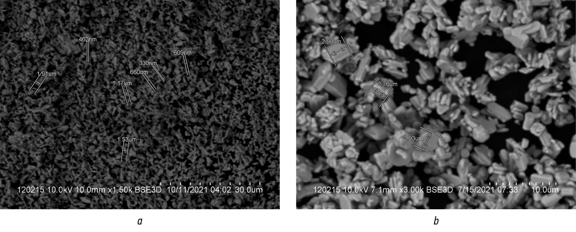Рис. 2. Изображение нано- (а) и микрочастиц (b) МоО3 с помощью растровой электронной микроскопии (на стрелках указаны размеры частиц, um — мкм).