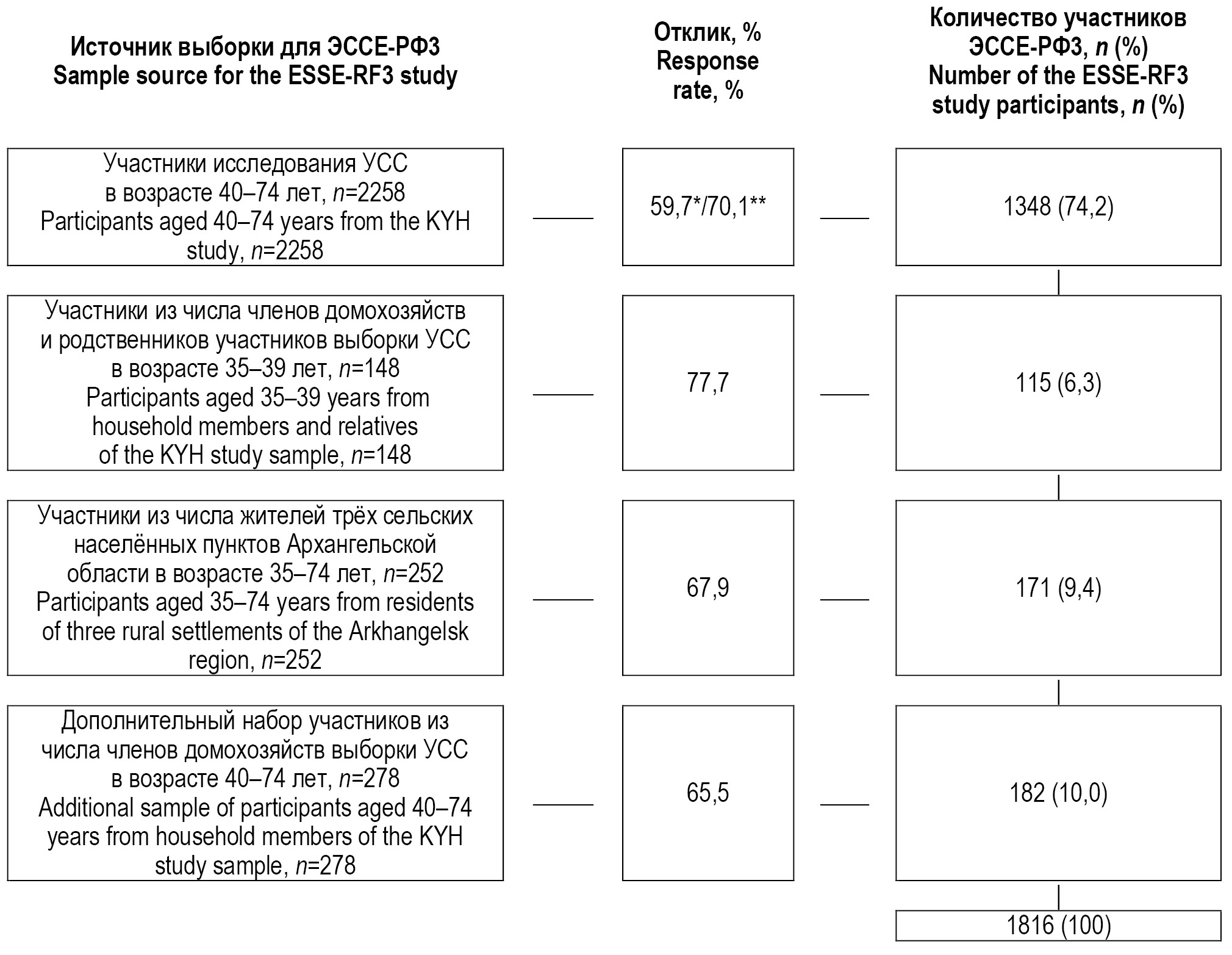 Выборочная совокупность была сформирована преимущественно из участников популяционного поперечного исследования УСС, проведённого в Архангельске в 2015–2017 гг. Участники исследования УСС изначально представляли собой случайную адресную выборку мужчин и женщин в возрасте от 35 до 69 лет, проживающих в четырёх округах Архангельска (Октябрьский, Ломоносовский, Маймаксанский и Майская горка). Основой формирования данной выборки послужила база данных территориального Фонда обязательного медицинского страхования Архангельской области (ФОМС АО), а именно деперсонализированный перечень адресов всех жителей Архангельска в возрасте от 35 до 69 лет, имеющих данные в системе ФОМС АО. Помимо адреса каждого застрахованного лица, для формирования выборки ФОМС АО предоставил также данные о поле и возрасте. Приглашение участников осуществлялось посредством поквартирных обходов случайно отобранных адресов специально подготовленными интервьюерами. При посещении отдельно взятого адреса к участию в исследовании приглашался только один проживающий по данному адресу человек, чей пол и возраст (±2 года) соответствовали данным ФОМС АО. Каждый согласившийся участник УСС (n=2478) прошёл интервью на дому и заполнил форму информированного согласия на предоставление исследовательской группе своих контактных персональных данных (фамилия, имя, отчество, адрес и номер телефона). Подавляющее большинство участников УСС (n=2380, из них 41,5% мужчин) прошли медицинское обследование в КДП Северного государственного медицинского университета. Перед началом каждому из участников была предоставлена возможность отказаться или согласиться на различные условия участия в исследовании, отражённые в форме информированного согласия. При заполнении формы информированного согласия 2324 человека дали согласие на приглашение к участию в новых исследованиях в будущем, 56 — отказались от данного предложения. Более подробно способ формирования выборки УСС и её характеристики описаны ранее [11]. С 2018 года в рамках сотрудничества Северного государственного медицинского университета с Медицинским информационно-аналитическим центром организовано проспективное наблюдение участников УСС (n=2357), давших информированное согласие на доступ к их медицинской и другой связанной со здоровьем документации в исследовательских целях. Исходя из данных динамического наблюдения, в период со времени участия в УСС до конца 2020 года 61 участник выбыл из-под наблюдения по причине смерти и 5 достигли возраста 75 лет. С учётом представленной выше информации, на момент запланированного старта сбора данных для ЭССЕ-РФ3 в Архангельской области в распоряжении исследовательской группы находились контактные данные 2258 участников УСС в возрасте от 40 до 74 лет, которые были приглашены к участию в ЭССЕ-РФ3. Приглашение осуществлялось администраторами ЭССЕ-РФ3 в КДП Северного государственного медицинского университета посредством телефонных обзвонов. Кроме того, тем участникам УСС, которым не удалось дозвониться после 3 и более попыток (n=498), были разосланы письма с приглашением поучаствовать в исследовании. Полное обследование по основному протоколу ЭССЕ-РФ3 прошли 1348 участников УСС в возрасте 40–74 лет; с 335 не удалось установить контакт (не дозвонились по телефону и не получили отклик на отправлен