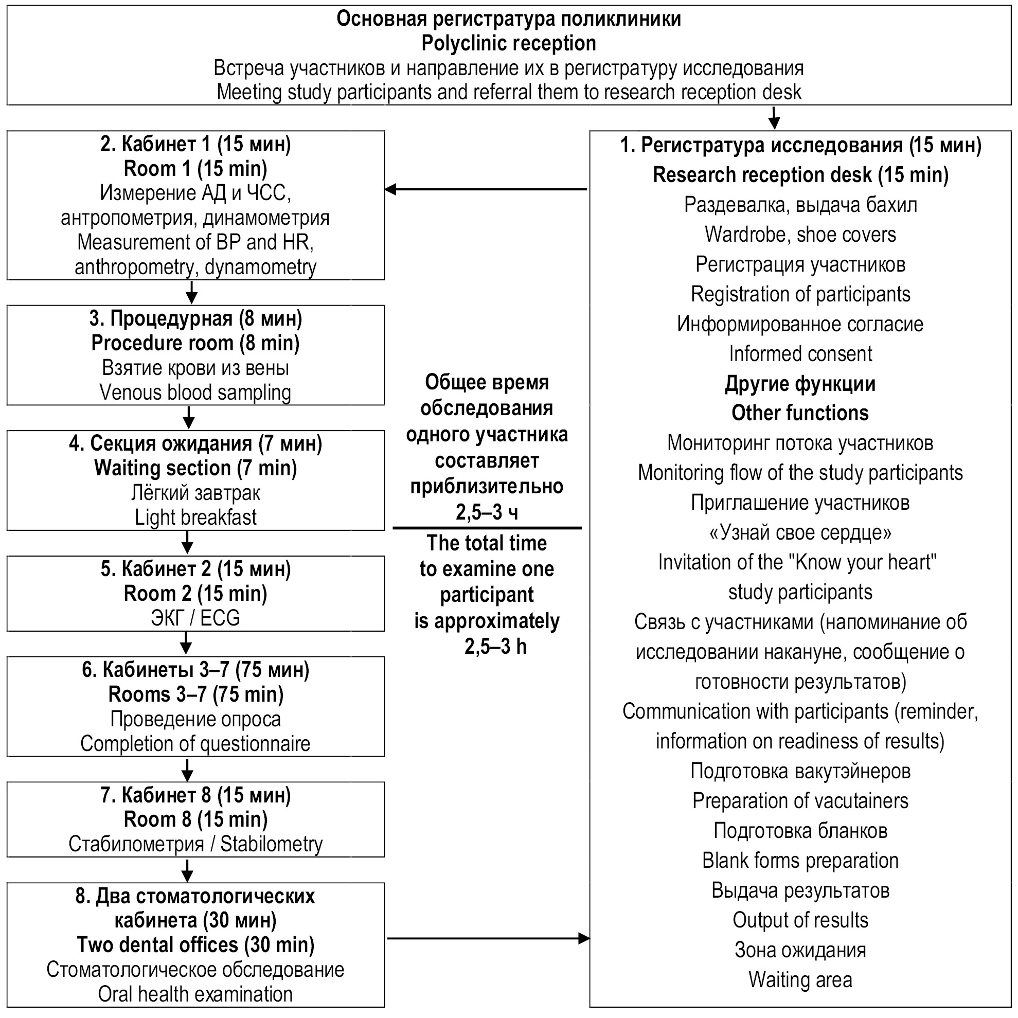 Рис. 2. Организационная схема обследования участников ЭССЕ-РФ3 в Архангельской области. Здесь: АД — артериальное давление; ЧСС — частота сердечных сокращений; ЭКГ — электрокардиография. Время в минутах указано приблизительно.