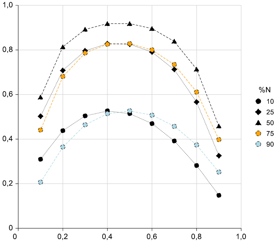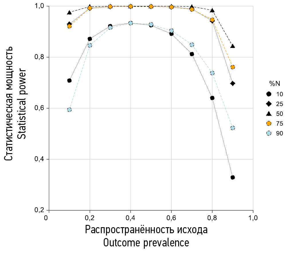 Рис. 4. Статистическая мощность логистических регрессионных моделей для выявления отношения шансов 2,0 и выше для распространённости исхода от 10 до 90% и распространённости фактора риска 10, 25, 50, 75 и 90% для выборки 1580 человек.