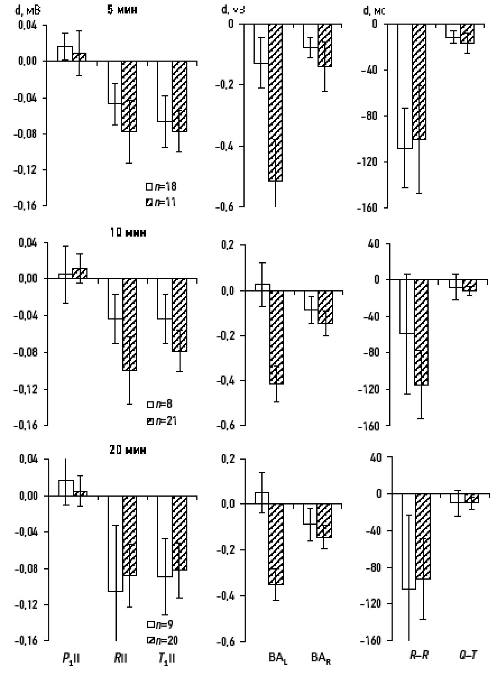 На 20-й минуте средней ОГ соотношение количества лиц в подгруппах изменилось: в 1-м кластере — 31%, а во 2-м — 69% от выборки. В этот период у лиц из 1-го кластера существенно уменьшались зубцы RII (р=0,010), T1II (р <0,001), суммарная BAR (р=0,020), интервал R–R (р=0,017) (см. рис. 2). Во 2-м кластере к таким же изменениям дополнились с высокой статистической значимостью уменьшения суммарной BAL (р <0,001) и интервала Q–T (р=0,005). Минутный объём кровообращения прирастал в 1-м кластере на 11,80±3,91 мл/кг · мин–1 (р=0,016), а во 2-м кластере — на 8,40±2,70 мл/кг · мин–1 (р=0,034). Всё это происходило на фоне статистически значимого ещё большего уменьшения SрO2 (р <0,001) у лиц 1-го (20,0±2,04%) и 2-го (19,6±1,08%) кластеров.