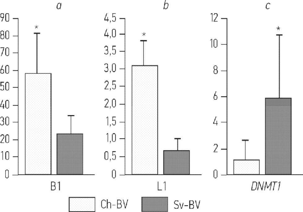 Рис. 1. Уровни транскрипции ретротранспозонов B1 (SINE) (a) и L1 (LINE-1) (b), а также гена DNMT1 (c), рассчитанной методом ΔCt с нормализацией на бета-актин. На гистограммах отображены средние значения показателей. Планки погрешностей отражают максимальные и минимальные значения. Ch-BV — условно-контрольная линия из вивария «Черноголовка», Sv-BV — линия, отобранная с экспонированной территории. * статистически значимые различия при p <0,05.