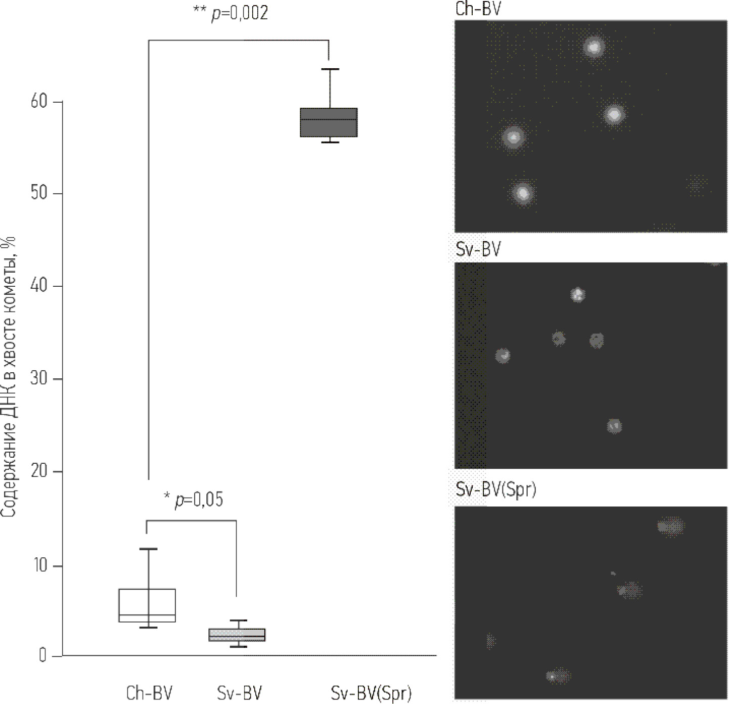 Рис. 2. Процентное содержание ДНК в хвосте кометы в клетках печени рыжей полёвки. Данные представлены в виде диаграммы линейных отрезков, отражающих величины медиан для исследуемых выборок животных с 25% и 75% (цветные прямоугольники) минимальными и максимальными значениями, выбросы (звезды). Sv-BV — экспонированные животные, обследованные в осенний период; Sv-BV(Spr) — экспонированные животные, обследованные в весенний период; Ch-BV — контрольная группа. * р=0,05 — статистически значимые отличия от контроля; ** р=0,002 — между экспериментальными группами (непараметрический U-критерий Манна–Уитни).