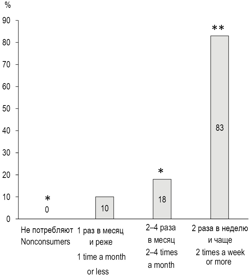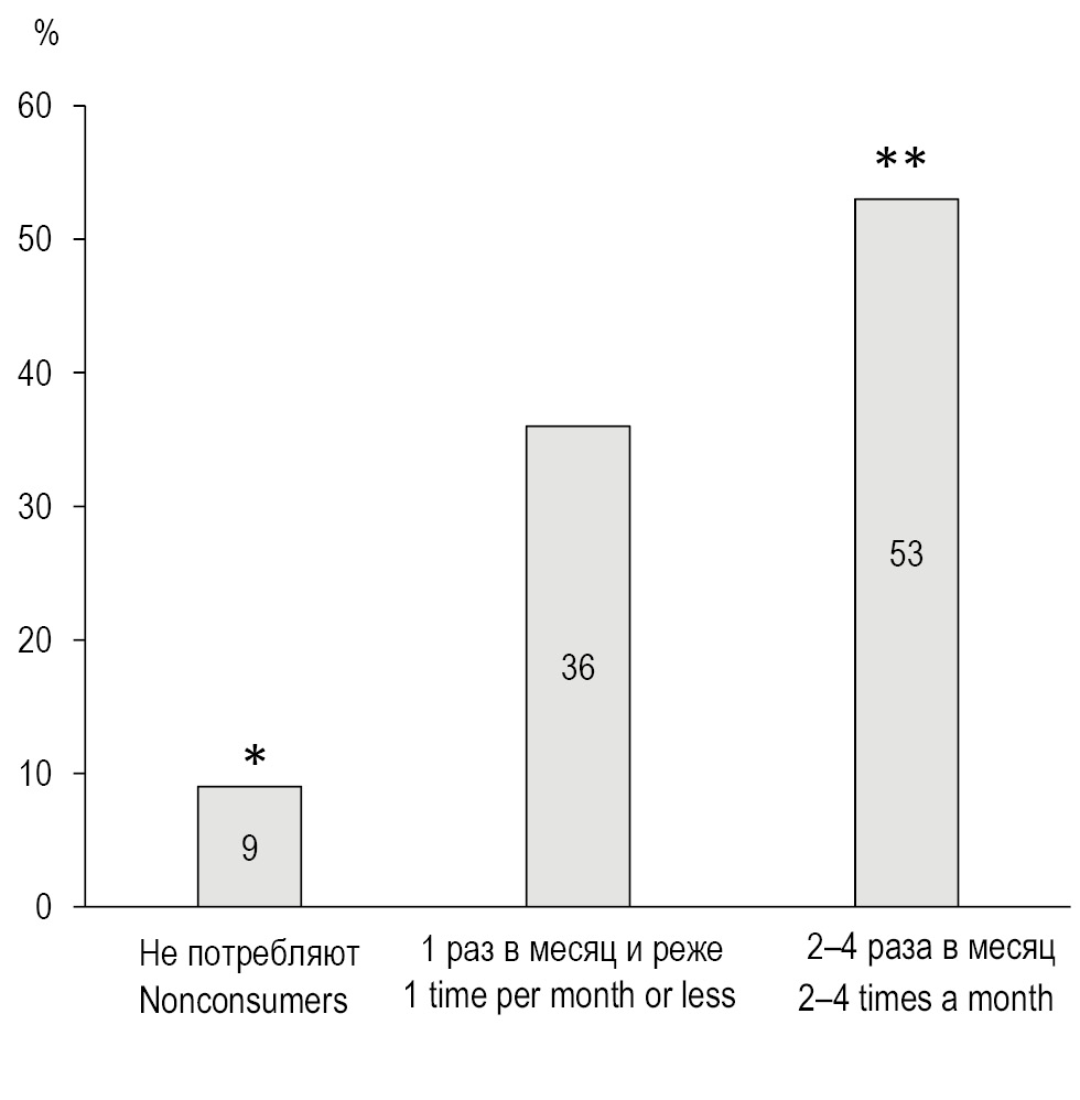 Дополнительный анализ опыта табакокурения у участников исследования выявил положительную связь относительного количества курильщиков с кратностью потребления алкоголя в группах мужчин (рис. 1) и женщин (рис. 2). При этом максимальная доля курильщиков присутствует в группе женщин, потребляющих алкоголь 2 раза в неделю и чаще, что статистически значимо (p <0,01) превышает относительное количество курильщиков среди женщин, не потребляющих алкоголь (F=3,677) и потребляющих его 1 раз в месяц и реже (F=3,853). Следует отметить, что среди мужчин не было выявлено лиц, потребляющих алкоголь 2 раза в неделю и чаще. Относительное количество курильщиков в группе мужчин, не потребляющих алкоголь, статистически значимо (p <0,01) уступает доле курящих мужчин среди потребителей алкоголя 2–4 раза в месяц (F=2,378).