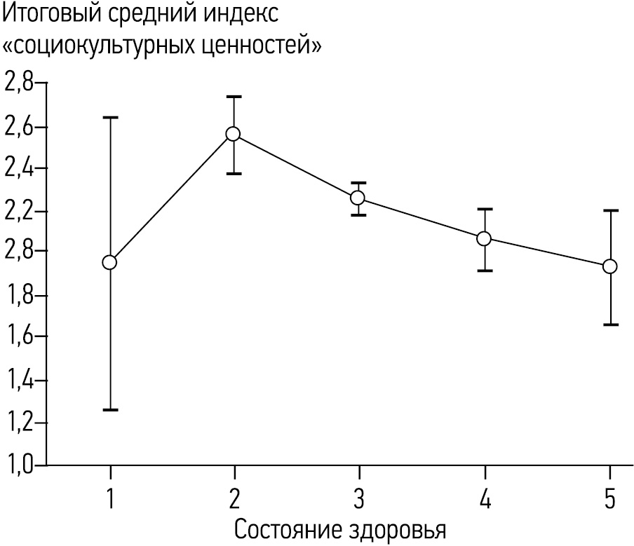 Рис. 1. Корреляция итогового среднего индекса социокультурных ценностей с субъективной оценкой состояния здоровья у пожилых жителей г. Петрозаводска.