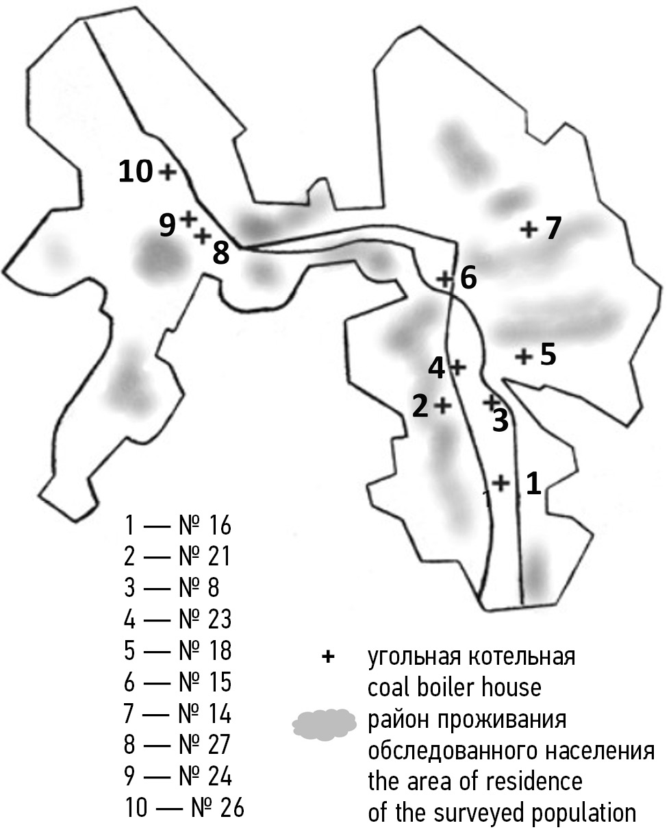 На каждом этапе работы использовали стандартную методику. Образцы снега отбирали в районах 10 угольных котельных (рис. 1) методом шурфа на всю глубину снегового покрова за исключением 5 см слоя над почвой; пробы снега (10–15 кг) помещали в полиэтиленовые пакеты (30 л) для доставки в лабораторию. В лаборатории пробы снега в течение суток растапливали в пластиковых контейнерах, часть чистой отстоянной воды (5–6 л) сливали, другую часть отфильтровывали через беззольные фильтры («синяя лента»). Снеготалую воду консервировали из расчёта на 1 л воды 3 мл концентрированной азотной кислоты марки «ос.ч.». Твёрдые фазы снега просушивали на фильтре, просеивали через сито (диаметр ячейки — 1 мм) и взвешивали. ТЧ разлагали методом автоклавной минерализации. Концентрацию меди в ТЧ и снеготалой воде определяли атомно-абсорбционным методом («Квант-2», Россия). Результаты анализа сравнивали с предельно допустимой концентрацией (ПДК) [27]: содержание меди в мелкодисперсной фазе — с ПДК в природной воде (0,1 мг/л); содержание меди в ТЧ снега — с ПДК в почве (55,0 мг/кг).