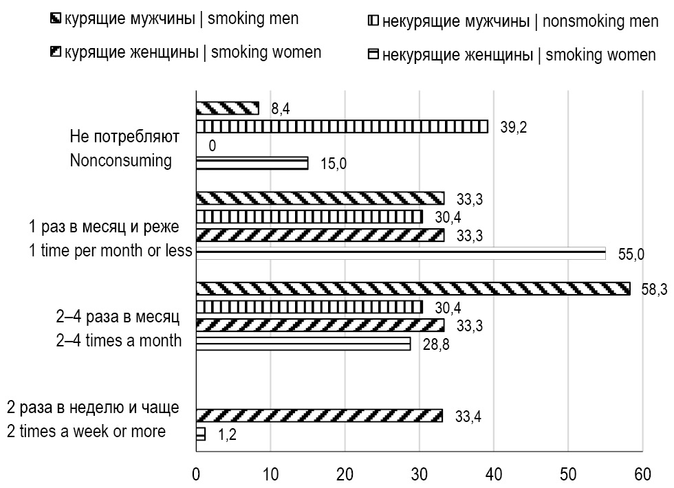 An additional analysis of the experience of alcohol consumption among smokers and non-smokers of students revealed a number of relationships between the studied addictions (Fig. 2). Among non-smoking men, the most pronounced, statistically significant prevalence of persons who do not consume alcohol was revealed, both relative to men who smoke who do not consume alcohol (F = 2.151, p <0.05) and relative to women who smoke who do not consume alcohol (F = 2.492, p <0.01). It should be noted that all women who smoke consume alcohol, in contrast to men who smoke, among whom 8.4% do not consume alcohol. The level of alcohol consumption among smoking men in most cases is 2-4 times a month, and among smoking women it is evenly distributed between 1 or less times a month, 2-4 times a month and 2 times a week or more often. At the same time, the minimum age of the first conscious sample of alcoholic beverages (12.7 ± 0.43 years) was found in male smokers, which does not statistically differ significantly from the age of the first alcohol sample in the groups of non-smoking men (14.8 ± 0.56 years) , smokers (15.6 ± 0.39 years) and non-smoking women (15.1 ± 0.24 years).