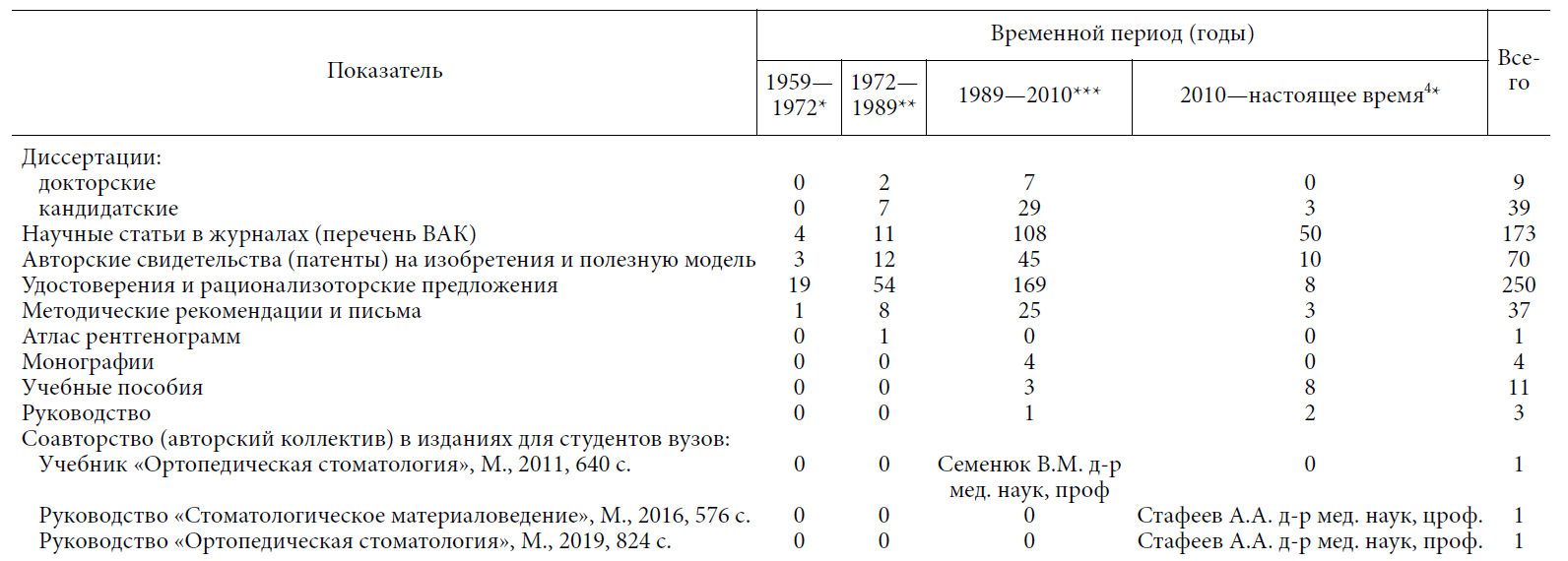 За последующий двадцать один год*** было подготовлено, защищено и утверждено 7 докторских (М.А. Звигинцев, С.И. Старосветсткий, Ю.Л. Писаревский, Е.Н. Онопа, И.В. Струев, А.А. Стафеев, А.В. Возный) и 29 кандидатских диссертаций (7 докторских и 26 кандидатских выполнены под руководством д.м.н., проф. В.М. Семенюка, 3 кандидатских под руководством д.м.н., доц. И.В. Струева), опубликовано 108 научных статей и 25 методических рекомендаций, получено 45 авторских свидетельств (патентов) и 169 удостоверений на рационализаторские предложения. Изданы 4 монографии, 3 учебных пособия и руководство. Соавторство в подготовке и издании учебника (см. таблицу). Научные исследования проводились по направлениям профилактика и лечение патологических состояний органов и тканей полости рта; влияние материалов зубных протезов на органы, ткани и среды организма; совершенствование методов лечения жевательно-речевого аппарата с применением современных несъёмных и съёмных ортопедических конструкций; профилактика осложнений со стороны пульпы и периодонта после препарирования зуба под цельнолитые протезы; использование зубов после гемисекции и гемисепарации под опору зубных протезов; лечение и профилактика непереносимости съемных протезов из акрилатов; осложнения, клинические и технологические ошибки при ортопедическом лечении больных с дефектами зубных рядов съемными и несъемными конструкциями. Разработка указанных направлений и плодотворная подготовка научных кадров достигла общероссийского признания [1—3, 7, 9, 10].
