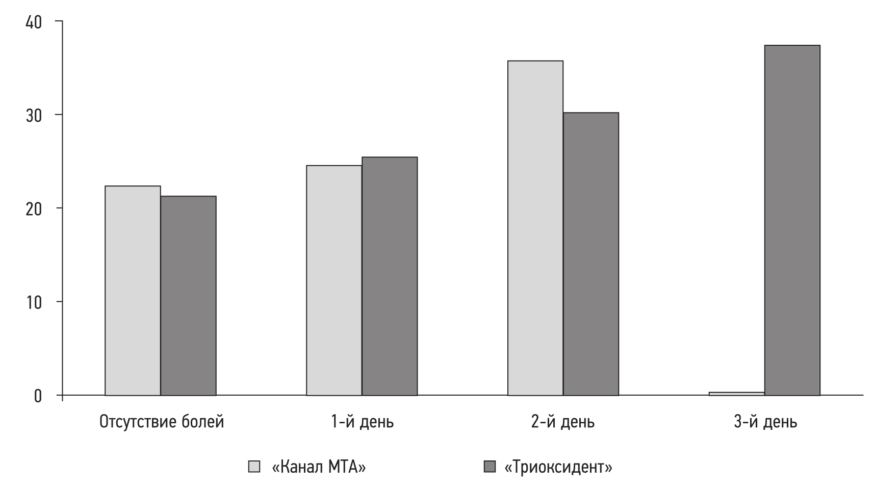 Результаты исследования показали, что применение материалов «Триоксидент» и «Канал МТА» является эффективным выбором для закрытия перфораций пульповой камеры при лечении глубокого кариеса и хронического пульпита. Боли после лечения отсутствовали у 30,8% и 42,1% пациентов в 1-й и 2-й группах соответственно (табл. 3).
