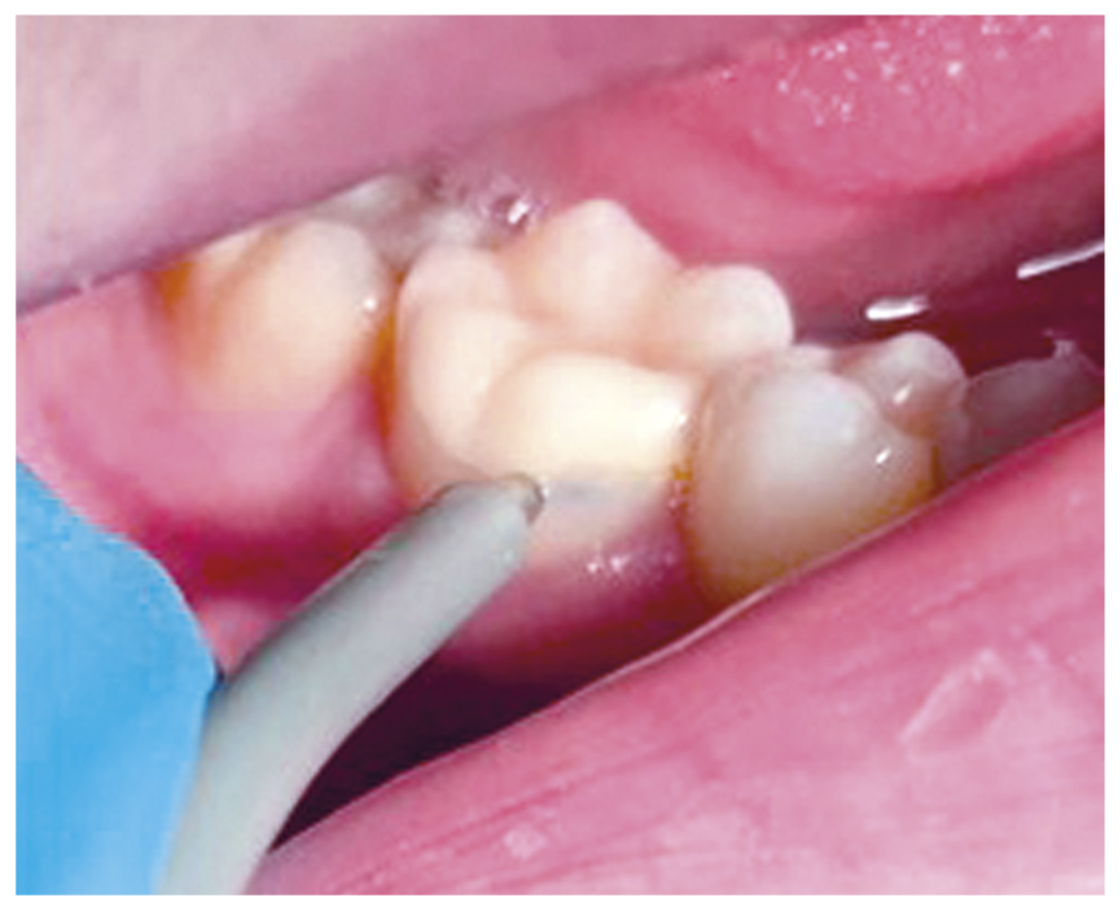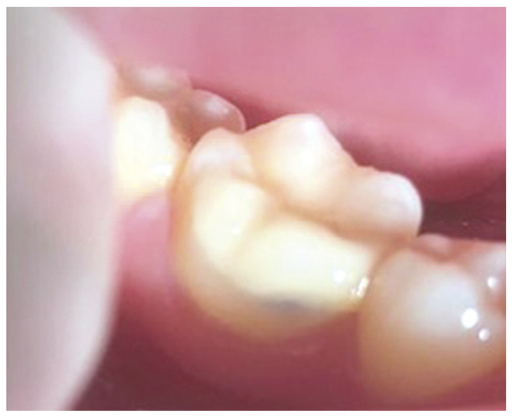 Рис. 3. Потемневший участок вестибулярной поверхности зуба 46 после использования материала «Канал МТА». / Fig. 3. Darkened area of the vestibular surface of the tooth 46 after using the material "MTA Channel".