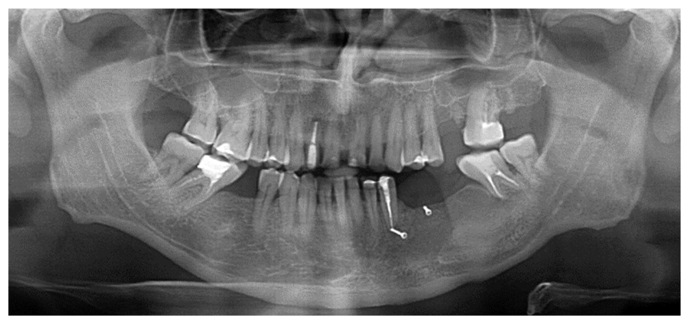 Рис. 1. Ортопантомограмма пациента И., 58 лет, исходная клиническая картина. / Fig. 1. Orthopantomogram of patient I., 58 years old, initial clinical picture.