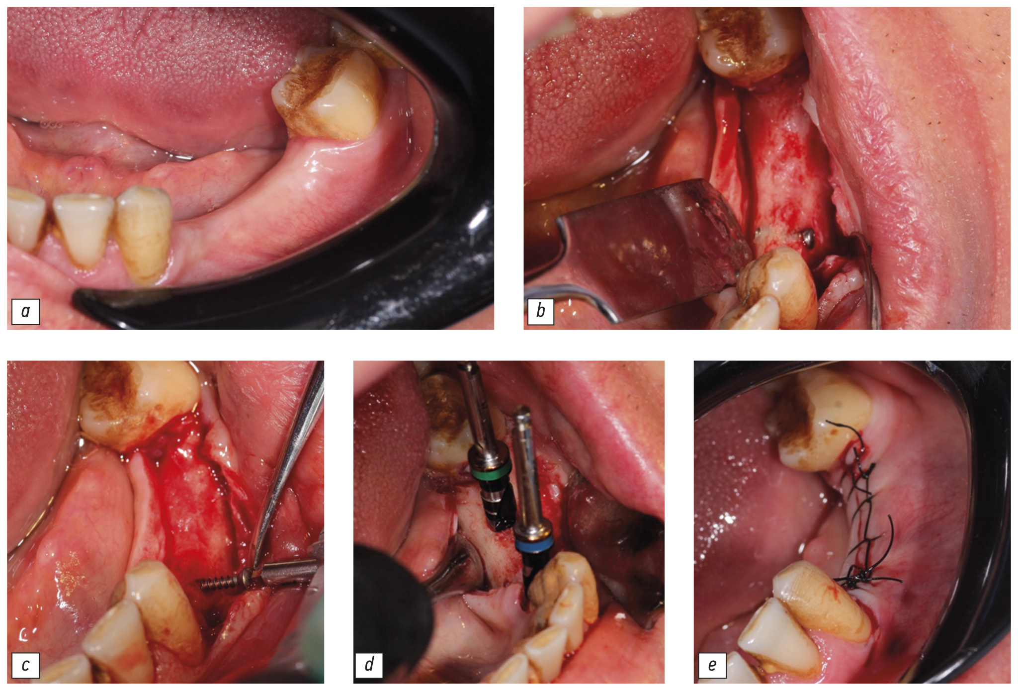 Рис. 6. Хирургических этап лечения частичного отсутствия зубов пациента И. a — полость рта до оперативного лечения; b — костная ткань после регенерации; c — удаление микровинтов; d — формирование ложа для дентальных имплантатов; e — восстановление анатомических соотношений в ране и наложение швов. / Fig. 6. Surgical stage of treatment of partial absence of teeth of patient I. a — oral cavity before surgical treatment; b — bone tissue after regeneration; c — removal of micro-screws; d — formation of a bed for dental implants; e — restoration of anatomical relations in the wound and suturing.