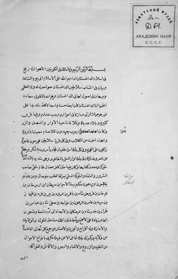 Рукописи в фондах Института восточных рукописей РАН из коллекции Хусаина Фаизханова 1866 г.