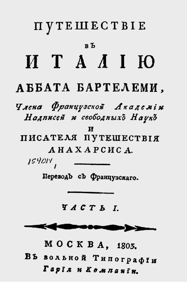 The essay deals with Barthélemy’s stay in Italy in 1755–1758, his first impressions of direct acquaintance with the monuments of ancient Roman culture, his plans for future academic work. It also reveals his close and lifelong friendship with the family of the Duc de Choiseul that would later in Paris become a turning point in his difficult choice between his dedication to the scholarship and material well-being. Barthélemy’s correspondence with his friends allows us to imagine the abbot’s understandable desire for a comfortable life, how his sense of duty and gratitude to powerful patrons drew the scholar into the circle of high-society life and moved away from his former friends increasing the number of enemies.