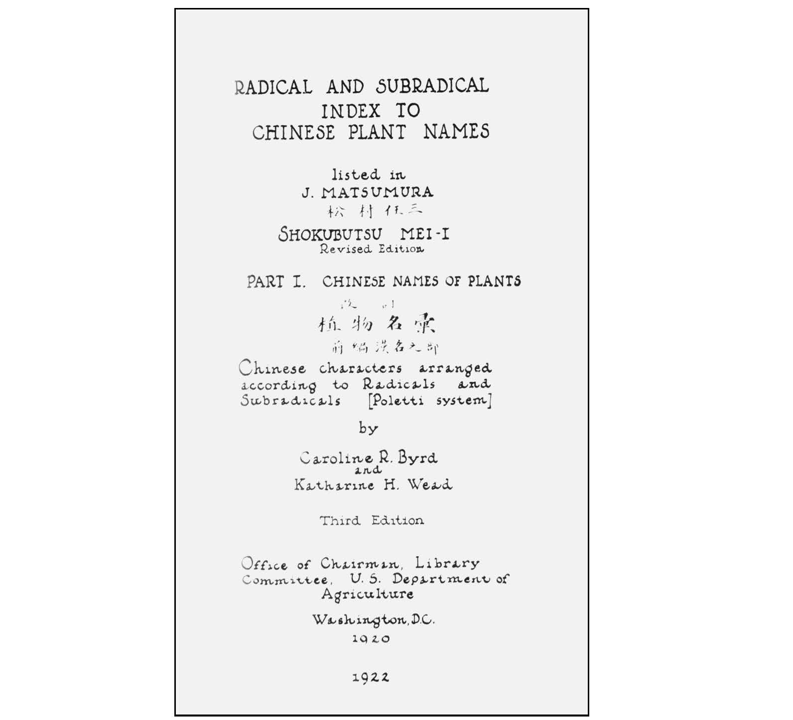 - Byrd, Caroline Rixford; Katharine Howes Wead 1920 — Radical and subradical index to Chinese plant names listed in J. Matsumura... Shokubutsu mei-i, rev. ed. Pt. 1. Chinese names of plants... Chinese characters arranged according to radical and subradicals