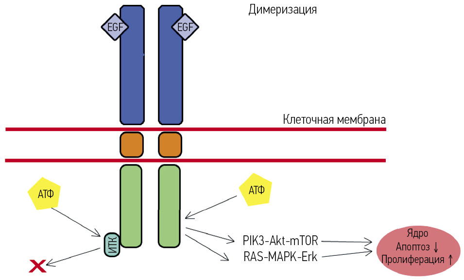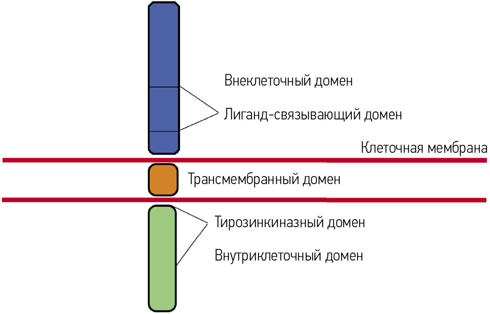 Рецептор эпидермального фактора роста (epidermal growth factor receptor), или EGFR-рецептор, относится к семейству рецепторов тирозинкиназ ErbB, состоящему из 4 представителей: ErbB1 (EGFR, HER1), ErbB2 (neu, HER2), ErbB3 (HER3), ErbB4 (HER4) [5]. EGFR способен индуцировать клеточную дифференцировку и пролиферацию через активацию при взаимодействии со специфическими лигандами. В структуре рецептора EGFR выделяют 3 зоны: внеклеточную; лиганд-связывающую – внутриклеточную, содержащую тирозинкиназу; трансмембранную – с единственной гидрофобной якорной последовательностью, с помощью которой рецептор пересекает клеточную мембрану (рис. 1). При взаимодействии лиганд–рецептор на поверхности клетки формируются гомо- и гетеродимерные комплексы, активирующие тирозинкиназу во внутриклеточном домене, что приводит к повышению каталитической активности и запуску сигнальных путей, отвечающих за клеточный рост, синтез ДНК и экспрессию протоонкогенов. Комплекс рецептор–лиганд впоследствии подвергается эндоцитозу и лизосомальному распаду либо утилизируется в плазматической мембране – эти процессы приводят к остановке активации EGFR-рецептора и служат регуляторами активности клетки [6, 7].