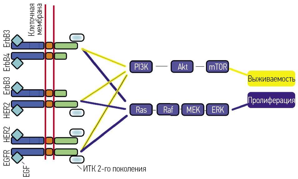 Так называемое 2-е поколение ингибиторов тирозинкиназ получило механизм необратимого ковалентного связывания ATФ-связывающего сайта не только EGFR, но и других представителей семейства ErbB, в том числе HER2, играющего ключевую роль в активации всего семейства ErbB (рис. 3) [27]. С биологической точки зрения это выгодно отличает представителей 2-го поколения от их предшественников, учитывая данные о гиперэкспрессии HER2 и HER3 при НМРЛ, а также о выявлении генетических аберраций в HER2, 3, 4 и в нескольких сигнальных молекулах в пределах внутриклеточных сигнальных путей ErbB, таких как KRAS, HRAS, BRAF и RASA1 [28].