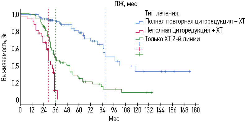 Медиана наблюдения в общей популяции всех включенных в исследование 214 больных составила 33,0 (диапазон 0,7–174,0) мес. При проведении сравнительного анализа продемонстрировано явное преимущество в отдаленных результатах лечения при достижении R0 повторной циторедукции: медиана ПЖ в группе R0 циторедукции составила 87,0 мес, тогда как медиана ПЖ в группе неполной повторной циторедукции независимо от диаметра резидуальной опухоли достоверно хуже, чем в контрольной группе пациенток, получивших только ХТ 2-й линии при платиночувствительном рецидиве РЯ с поражением ЛУ: 29,0 мес против 36,0 мес; р<0,0001 (рис. 1).