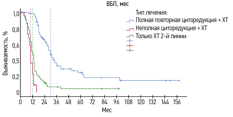 Рис. 4. ВБП при платинорезистентном рецидиве РЯ с поражением ЛУ в зависимости от типа лечения.
