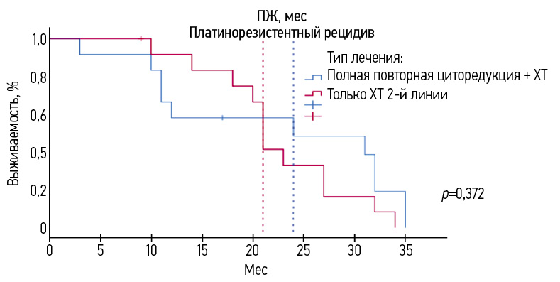 Рис. 1. ПЖ при платиночувствительном рецидиве РЯ с поражением ЛУ в зависимости от типа лечения.