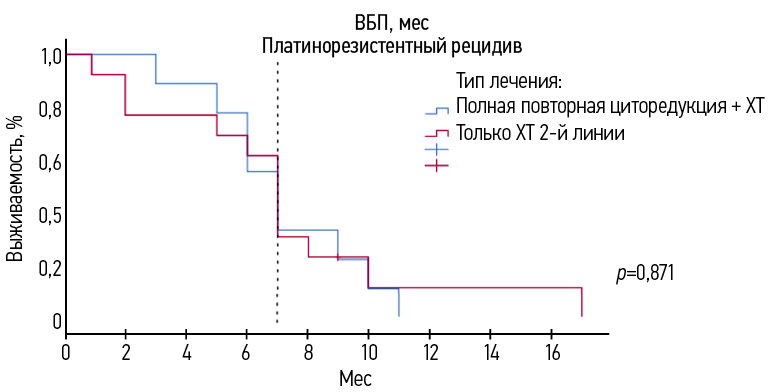 Медиана ВБП в контрольной группе больных с длительностью бесплатинового интервала <6 мес (платинорезистентный рецидив) равнялась 7,0 мес, а медиана ПЖ – 21,0 мес. Полученные данные соизмеримы с результатами зарубежных работ, посвященных лекарственному лечению платинорезистентного рецидива РЯ: медиана ВБП варьировала от 8,8 до 10,4 мес, а медиана ПЖ – 21,1–22,4 мес [18, 19]. С целью определения целесообразности оперативного лечения у больных с длительностью бесплатинового интервала <6 мес (платинорезистентный рецидив) нами проведен сравнительный анализ отдаленных результатов исследуемой группы больных с контрольной, который продемонстрировал отсутствие статистически значимых различий в отдаленных результатах лечения в обеих группах больных.
