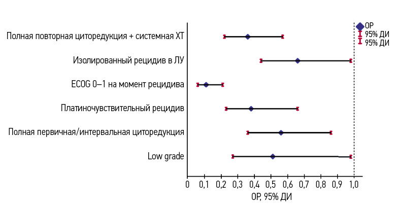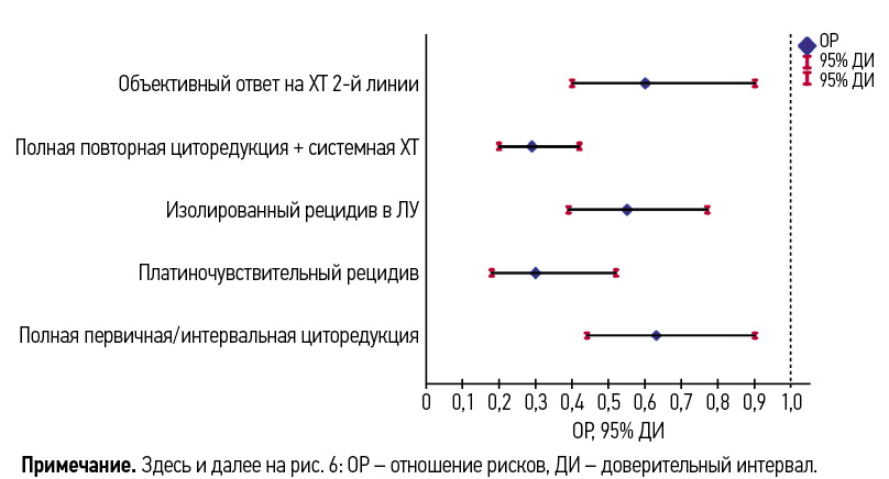 Как показано на рис. 5, достоверным самостоятельным благоприятным влиянием на ВБП при многофакторном анализе обладали: R0 первичная или интервальная циторедукция, длительность бесплатинового интервала >6 мес (платиночувствительный рецидив), изолированный рецидив в ЛУ, комбинированное лечение рецидива РЯ (R0 повторная циторедукция + системная ХТ) и объективный ответ (полный или частичный эффект) на ХТ 2-й линии.