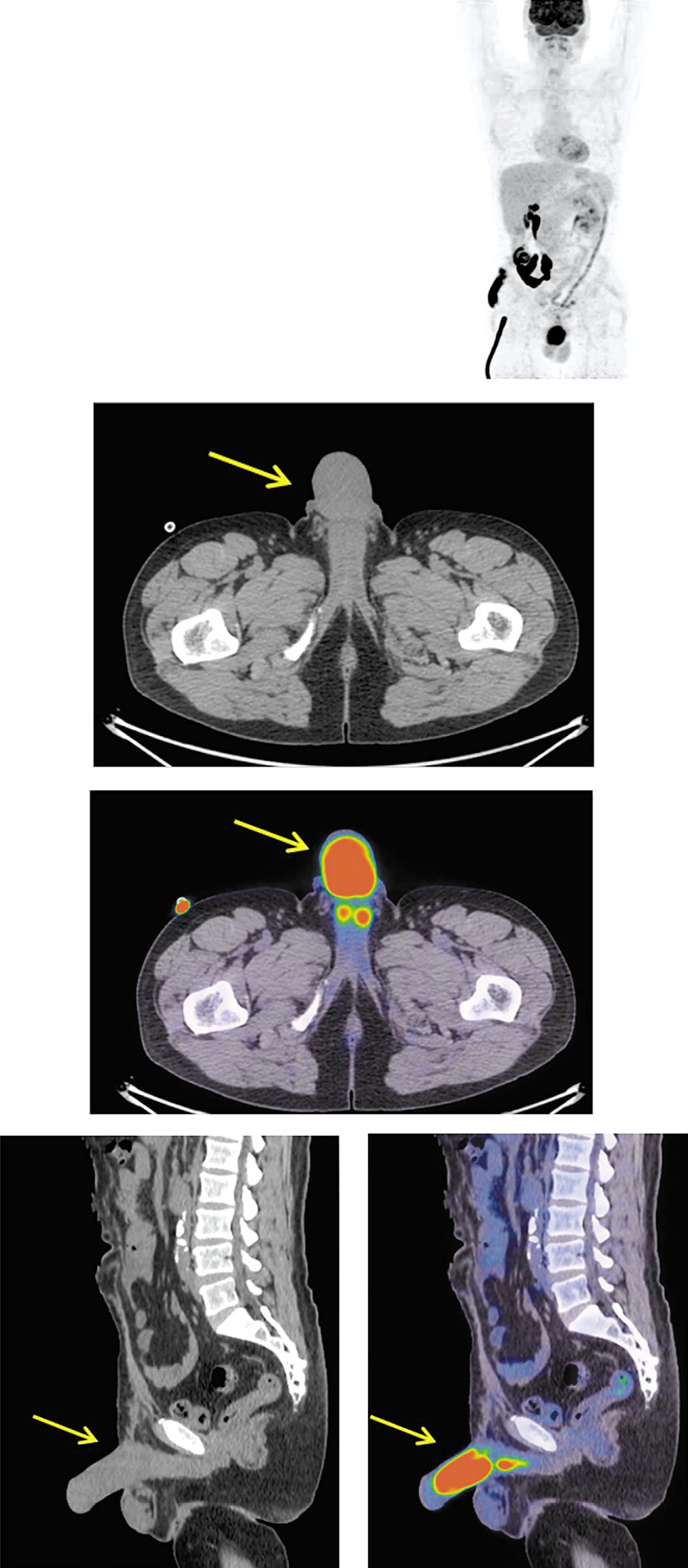 Пациенту выполнена позитронно-эмиссионная томография, совмещенная с компьютерной томографией (ПЭТ/КТ), с 18-фтордезоксиглюкозой (ФДГ). На MIP, аксиальной и сагиттальной КТ и ПЭТ/КТ-проекциях в кавернозных телах полового члена с двух сторон, ближе к корню полового члена, на протяжении до 33 мм отмечается симметричная фиксация радиофармпрепарата (РФП), коэффициент максимального стандартизированного накопления SUVmax составил 9,82. Другая зона повышенной фиксации РФП циркулярного характера обнаружена на протяжении кавернозных тел в дистальном направлении, длиной до 80 мм, SUVmax 12,44 с признаками приапизма (рис. 1).