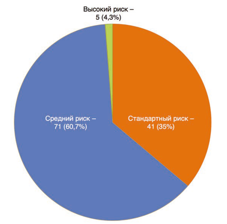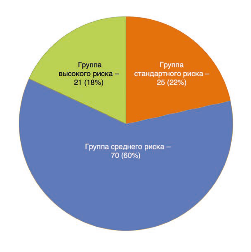 В результате больные на 15-й день терапии стратифицированы следующим образом: в группу стандартного риска вошли 25 (22%) пациентов, среднего риска – 70 (60%) и высокого риска – 21 (18%); рис. 4.