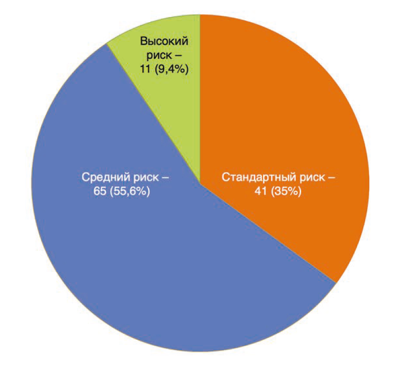 В соответствии с критериями BFM в группу стандартного риска вошли 41 (35%), в группу среднего риска – 71 (60,7%) и в группу высокого риска – 5 (4,3%) пациентов (рис. 1).