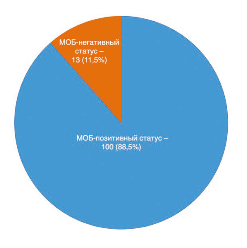 Всего 13 (11,5%) больных достигли МОБ-негативного статуса к 15-му дню лечения, у 100 (88,5%) пациентов определялся МОБ-позитивный статус (рис. 3).