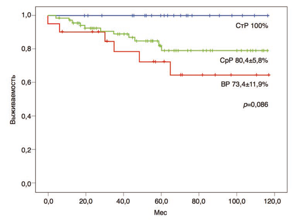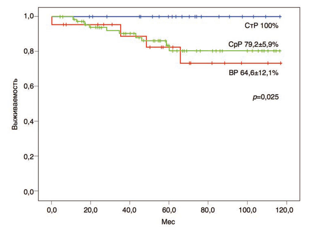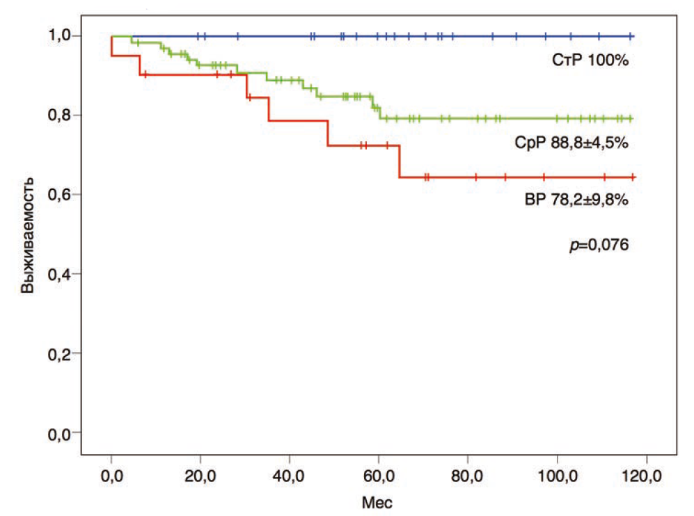 Результаты. Учитывая стратификацию, основанную на уровне МОБ, оказалось возможным идентифицировать группу «истинно» стандартного риска, выживаемость которой достигла 100%.