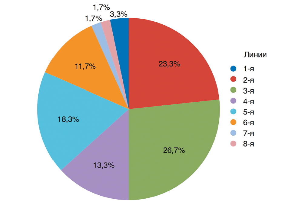В качестве 1-й линии (антрациклины и таксаны пациентки получали в адъюванте, после чего отмечено раннее прогрессирование) лечение получили 2 (3,3%) пациентки, в качестве 2-й – 14 (23,3%), 3-й – 16 (26,7%), 4-й и более – 28 (46,7%) больных (рис. 2). Таким образом, чуть более 1/2 (53,3%) пациенток получили лечение в ранних линиях (1–3-я), остальные – в более поздних. Среднее число циклов эрибулина в комбинации с трастузумабом составило 5 (2–27).