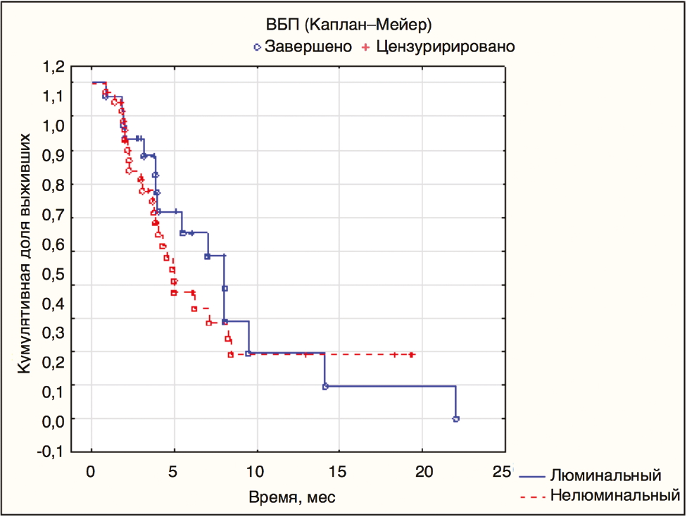 Рис. 4. ВБП при люминальном и нелюминальном HER2-положительном мРМЖ.