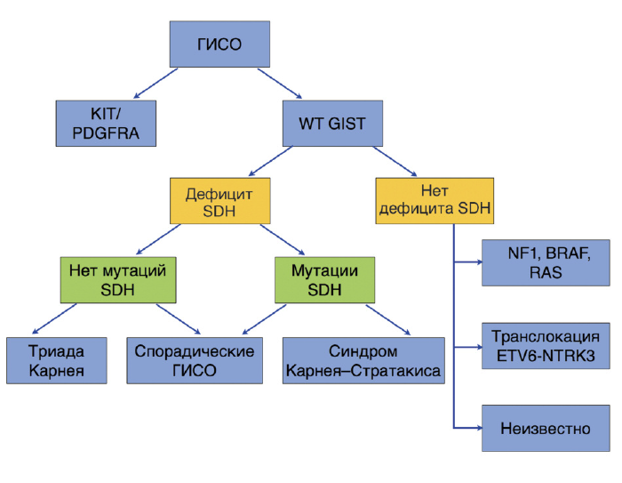 В настоящее время выделяют три варианта dSDH GIST: спорадические ГИСО, триада Карнея и диада Карнея (синдром Карнея–Стратакиса).