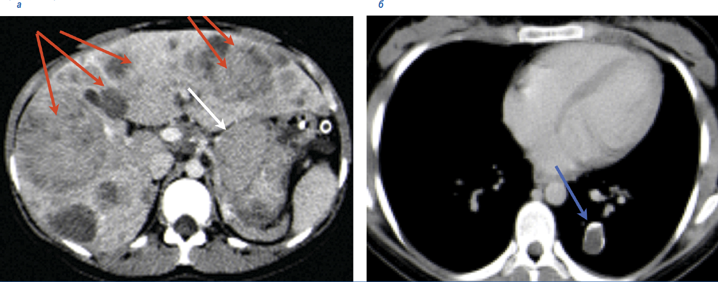Рис. 2. Данные КТ до начала лечения: а – опухоль желудка (белая стрелка), а – метастазы в печени (красные стрелки); б – хондрома в левом легком (синяя стрелка).