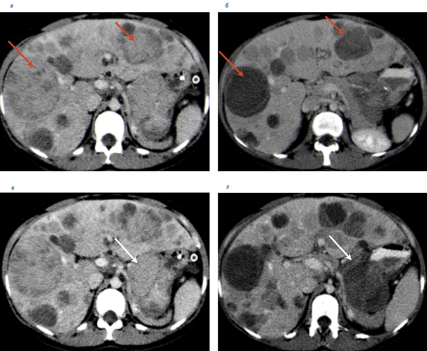 Рис. 3. КТ в динамике на фоне приема иматиниба: а, в – до начала лечения, а – метастазы в печени, в – опухоль в желудке (февраль 2019 г.), б – через 2 мес терапии (апрель 2019 г.) – кистозная трансформация метастазов в печени, г – через 2 мес терапии, кистозная трансформация опухоли в желудке.