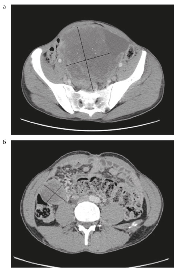 Клиническая картина редких форм первичных новообразований брюшины, как правило, не имеет специфических характеристик, и часто на ранних стадиях у пациентов отсутствуют симптомы заболевания. Однако, когда опухоль достигает ощутимо больших размеров, могут возникать боли в зависимости от локализации опухолевого конгломерата, который может стать причиной развития синдрома компрессии полого органа, механического блока желчных протоков или мочеточников, кишечной непроходимости. Кроме того, возможны и другие неспецифические симптомы: разлитые боли и дискомфорт в животе, увеличение живота в объеме, потеря массы тела, общая слабость, рвота [2, 7, 8]. Для СФО также характерен опухолевый асцит, этиология которого может быть не распознана в течение длительного времени [9].