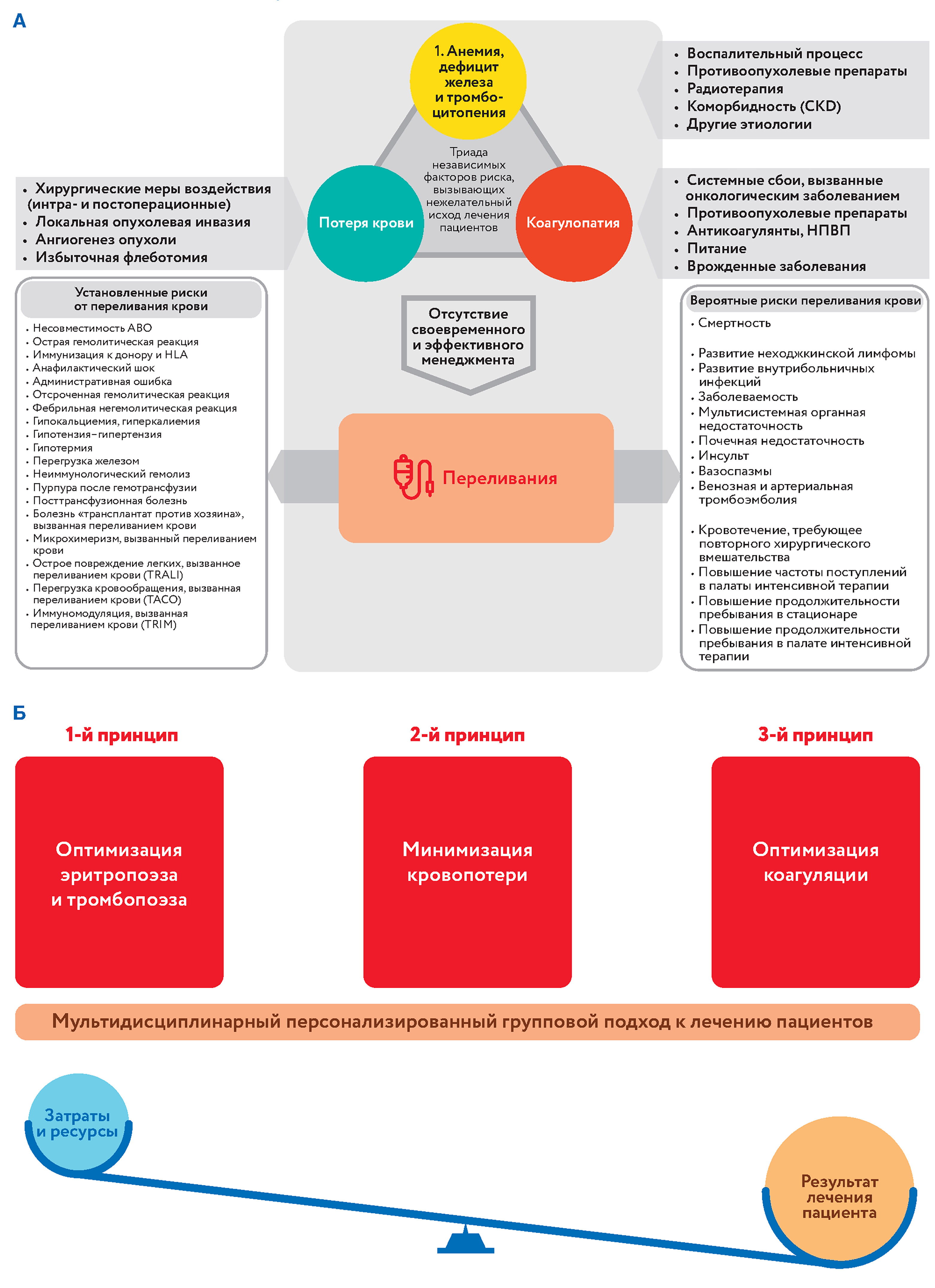 Рис. 1. А – гематологические факторы риска неблагоприятных исходов у онкологических больных; Б – адаптированная трехкомпонентная стратегия МКП при раке и, как следствие, сокращение использования крови.