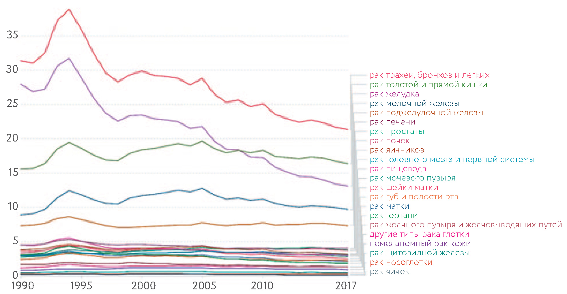 Fig. 2. Age-standardised cancer death rates by type, Russian Federation, 1990 to 2017 [55].