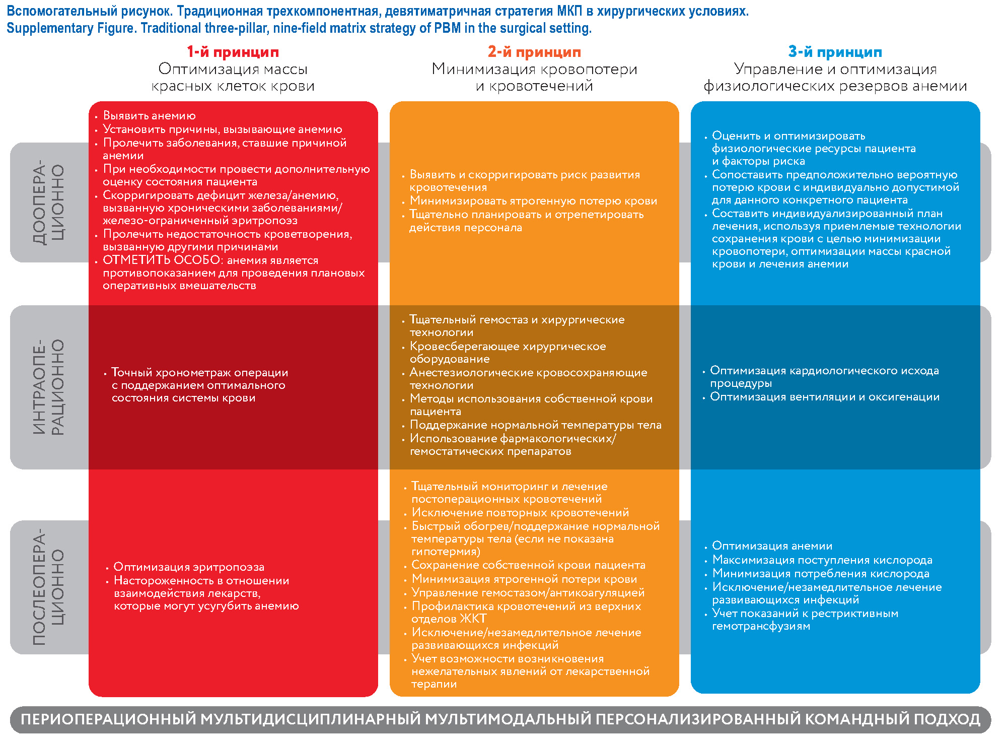 Изначально с акцентом на хирургическое лечение, преимущественно плановое, международная мультидисциплинарная сеть клиницистов и исследователей внесла свой вклад в развитие МКП, новаторскую и целостную концепцию, направленную на нивелирование факторов риска развития анемии путем своевременной оптимизации использования собственных объемов крови пациентов, минимизации кровопотерь, а также путем управления и оптимизации индивидуальной физиологической переносимости анемии у пациентов (см. вспомогательный рисунок) [33]. МКП определяется как применение научно обоснованных медицинских и хирургических концепций, нацеленное на достижение оптимальных клинических результатов у пациентов, путем преимущественной ориентации на собственную кровь пациента, а не на использование донорской крови. Как показывают многочисленные наблюдения больших многоцентровых наблюдательных исследований и рандомизированных контролируемых исследований, программы МКП [34–36] или отдельные терапевтические походы с МКП [37–39] значительно улучшают результаты лечения пациентов и одновременно сокращают утилизацию ресурсов. В 2010 г. Всемирная ассамблея здравоохранения (WHA) поддержала МКП в своей резолюции WHA63.12 [40]. Тем временем отдельные профессиональные сообщества и структуры здравоохранения в мире разработали клинические рекомендации по МКП, а также по их внедрению в практику [41–44].