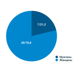 Сравнительный анализ по полу у пациентов с мутациями в гене EGFR позволил выявить наличие его у 26/78,8% женщин и только лишь в 7/21,2% случаев у мужчин. Различия между ними статистически значимые (p<0,001); рис. 4. Медиана возраста у мужчин и женщин составила 65 и 66,5 года соответственно.