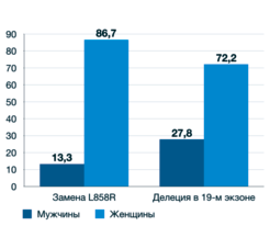 Рис. 5. Спектр активирующих мутаций в гене EGFR в зависимости от пола (%).